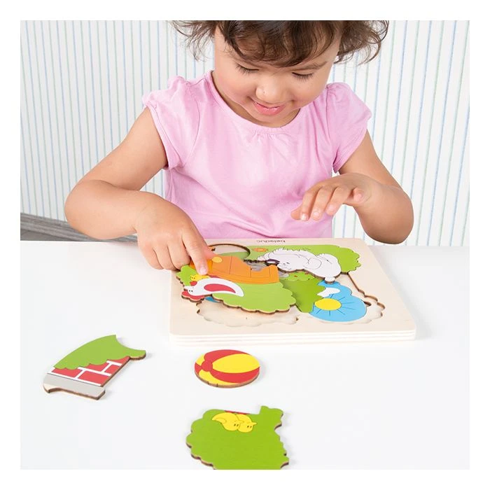 Ontdek wat er onder de eerste laag van de houten lagen puzzel tuin schuil gaat. De opening in de bovenste laag van de lagen puzzel tuin helpt je de onderste laag te raden. De lagen puzzel tuin stimuleert de nieuwsgierigheid en fantasy van kinderen.