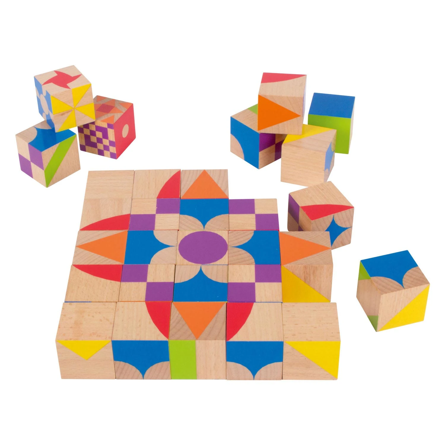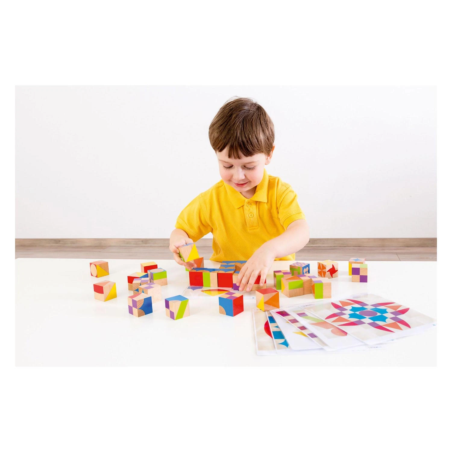 Houten blokken met kleurrijke figuren waarmee je vrolijke mozaïeken kunt vormen. Inhoud: 41 blokken. Geschikt vanaf 4 jaar.