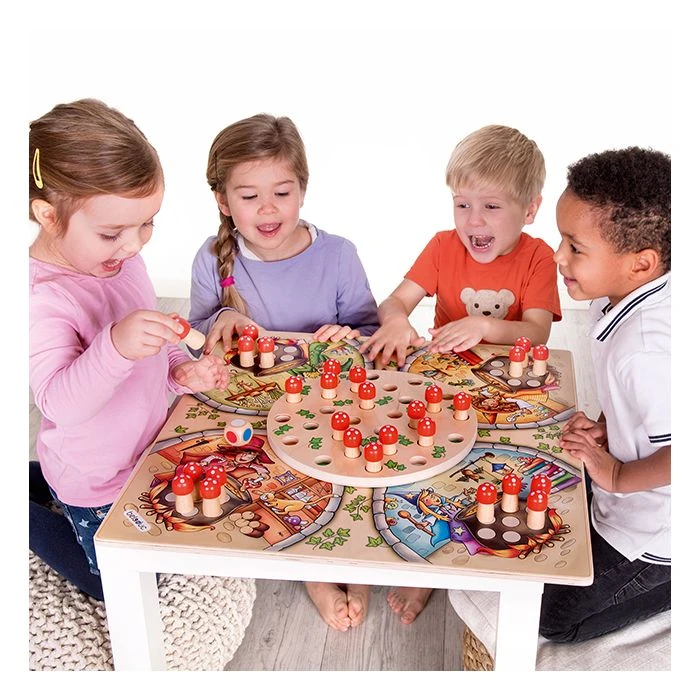 | Inhoud | 1 speelbord met draaischijf, 28 paddenstoelen 4,5 cm, 1 kleurendobbelsteen, 1 katoenen opbergzak |