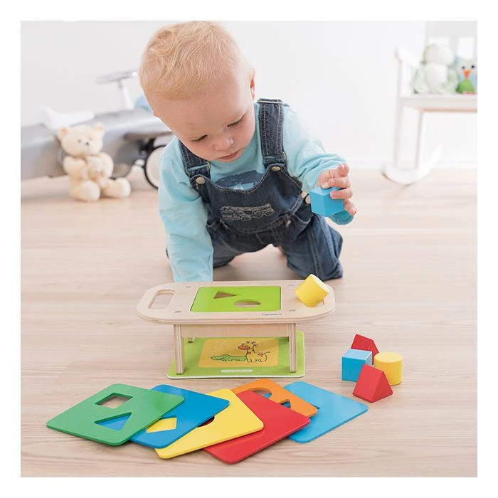 Sorteer vormen met deze houten verwisselbare vormenstoof. Pas zelf eenvoudig het niveau aan door een van de zeven sorteerplaten op de vormenstoof te leggen.