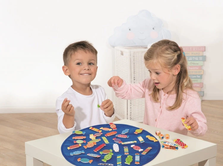 De spelers gooien een gekleurde dobbelsteen en moeten snel het snoepje vinden dat overeenkomt met de kleur die wordt gegooid. Heb jij de meeste snoepjes? Dan win jij het spel! Varieer met de moeilijkheidsgraad in het spel en gebruik meer dobbelstenen. Probeer hiermee moeilijkere kleurcombinaties te ontdekken.