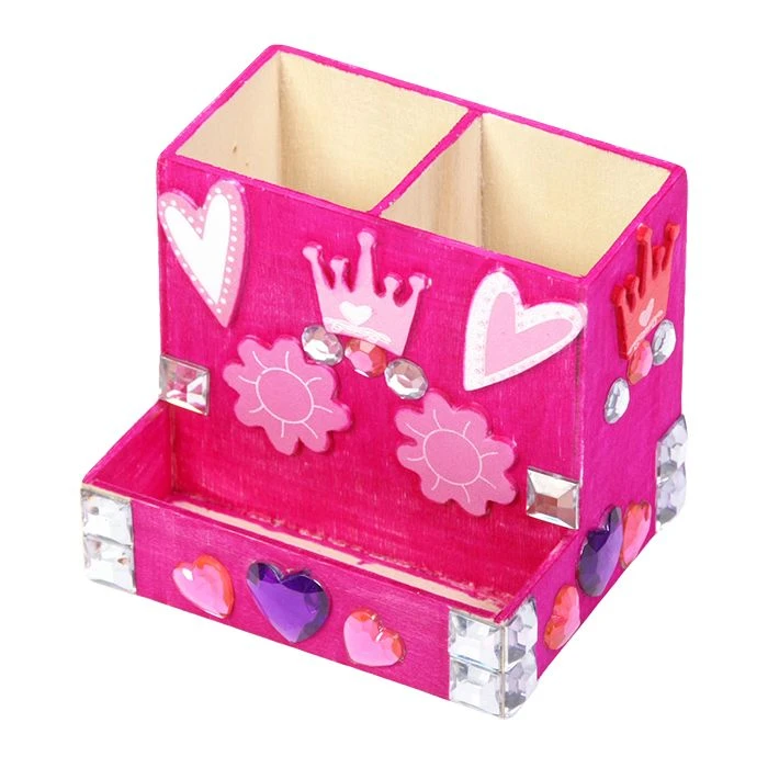 Knutsel een bureauset van hout. Geef de bureauset een mooie kleur, maak er een tekening op of plak er stickers, plaatjes e.d. op. Een goed idee voor op het bureau van papa of mama.