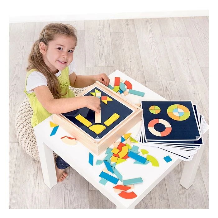 Houten geometrische vormen met magnetische onderkant. Gebruik de voorbeeldkaarten of laat je fantasie de vrije loop. De deksel en bodem zijn magnetisch, hierdoor kunnen er twee kinderen tegelijk mee spelen. Spelenderwijs worden de fijne motoriek en het geconcentreerd bezig zijn gestimuleerd.