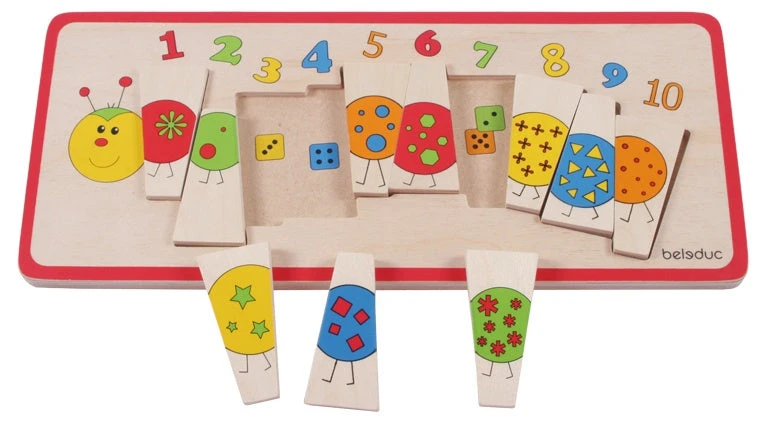 Leer tellen met deze leuke puzzel van beleduc. De puzzel heeft tien stukken die het lijf van de rups vormen. Staan er drie sterren op het lijf? Zoek dan het goede cijfer erbij en kijk of het puzzelstuk past. Zo leren kinderen spelenderwijs tellen.